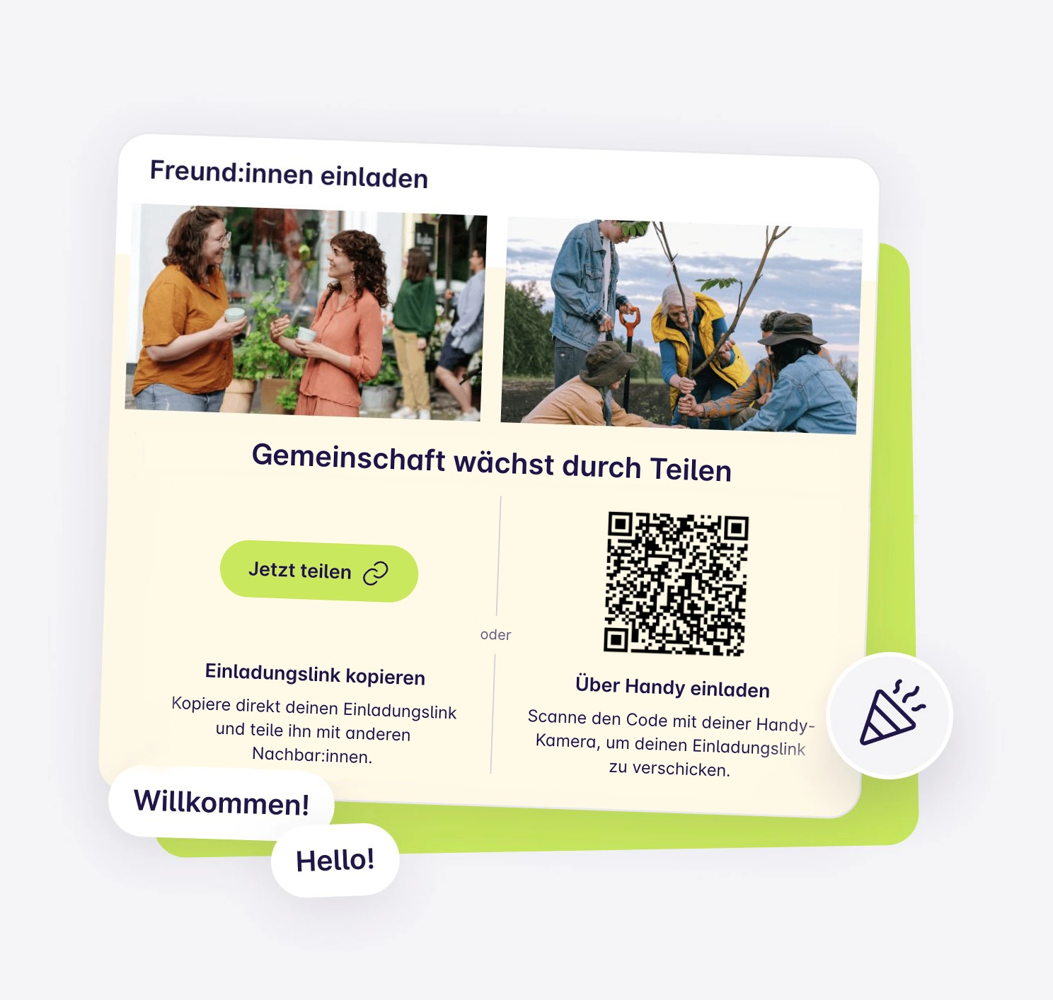Lade deine Nachbar:innen, Freund:innen oder Familie in ganz Deutschland ein, Teil von nebenan.de zu werden! Je mehr Menschen du erfolgreich einlädst, desto größer ist deine Chance auf 500 €! Gemeinsam stärken wir die Nachbarschaft.
